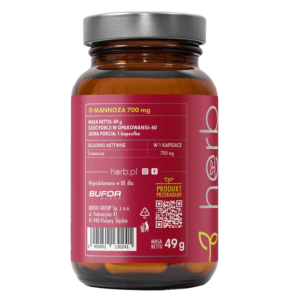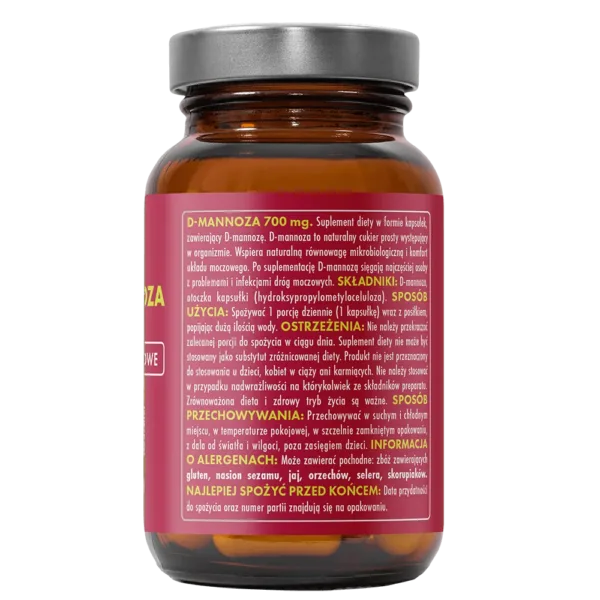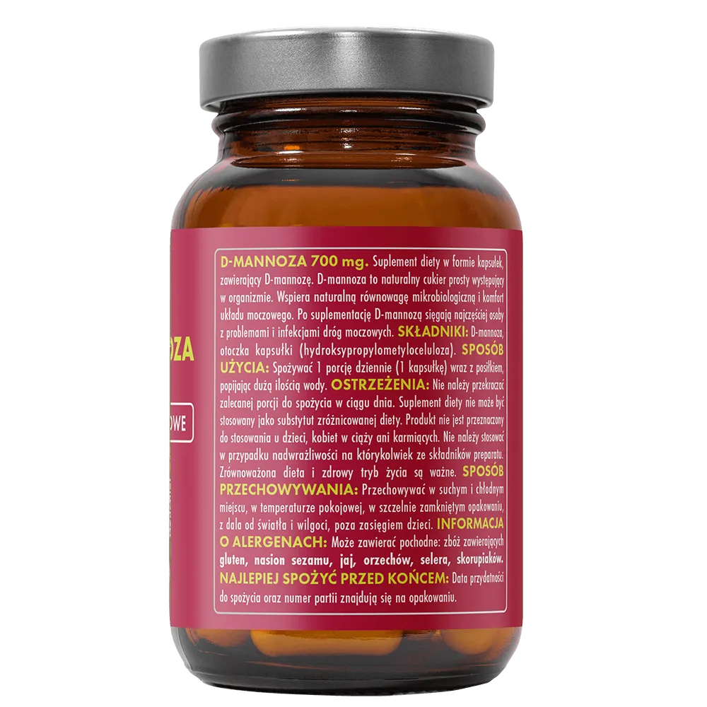 Każda kapsułka zawiera 700 mg czystej D-mannozy bez dodatku sztucznych substancji aktywnych. Dzięki zastosowaniu celulozowych kapsułek, produkt jest odpowiedni także dla wegan i osób z nietolerancją na żelatynę. Minimalistyczny skład i naturalne pochodzenie substancji czynnej sprawiają, że D-mannoza 700 mg to bezpieczna i wygodna forma wsparcia dla osób borykających się z nawracającymi infekcjami dróg moczowych. Idealny wybór zarówno do krótkoterminowego stosowania, jak i jako element długofalowej profilaktyki.