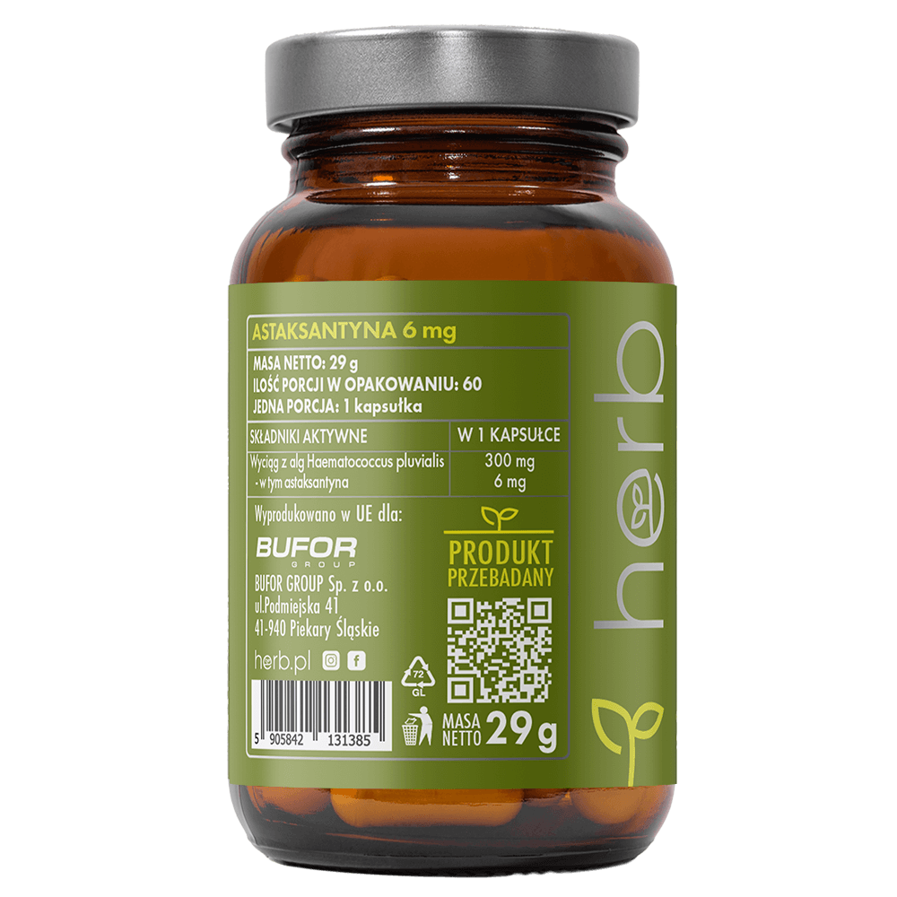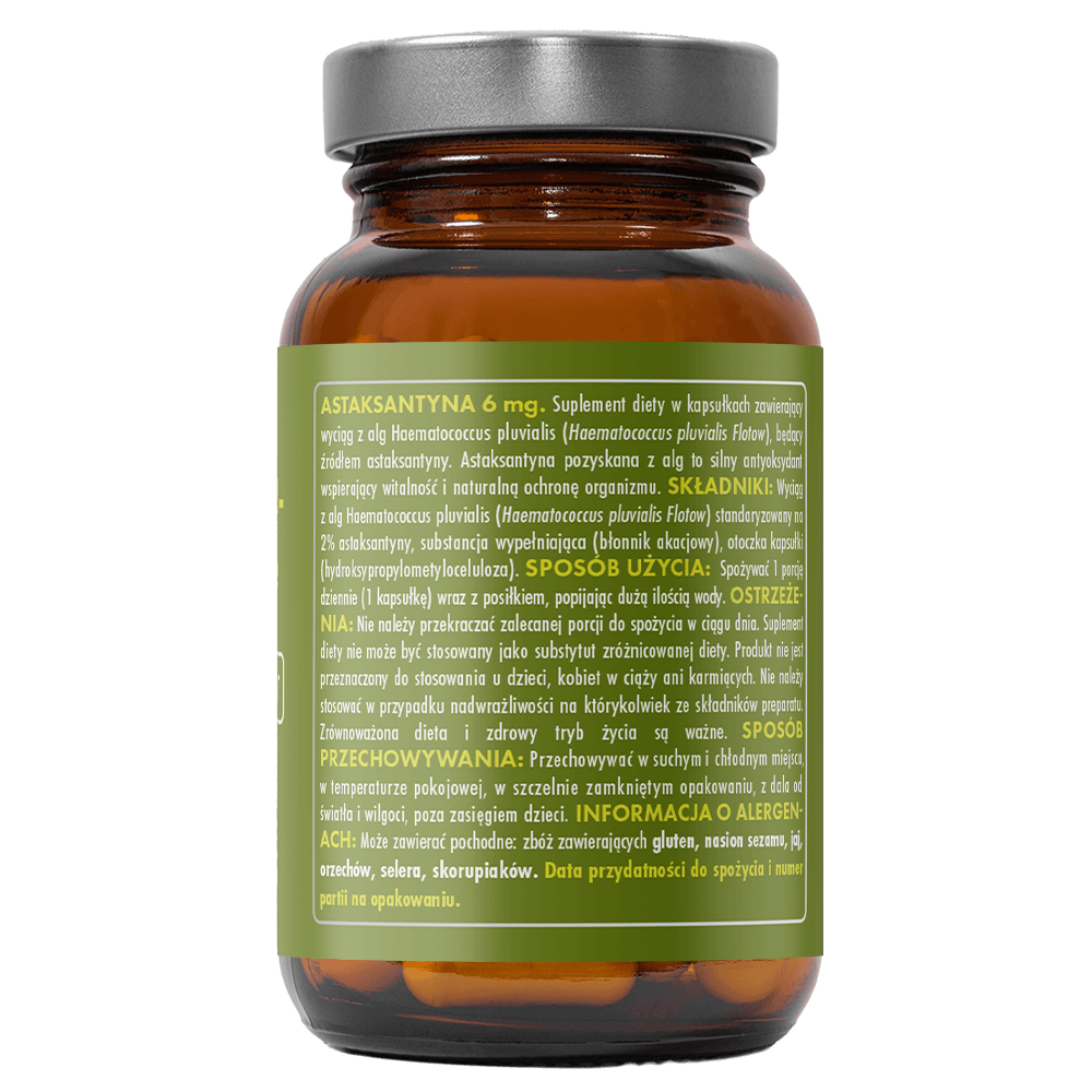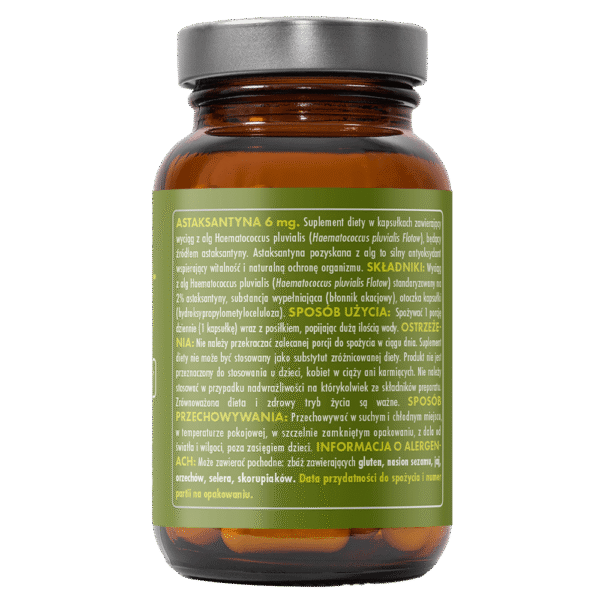 Astaksantyna ceniona jest również za wspomaganie zdrowia skóry, wzroku oraz układu sercowo-naczyniowego. Regularna suplementacja może sprzyjać zachowaniu młodszego wyglądu i lepszego samopoczucia. Produkt nie zawiera zbędnych dodatków ani składników odzwierzęcych – jest odpowiedni dla wegan i osób ceniących prosty, czysty skład.
