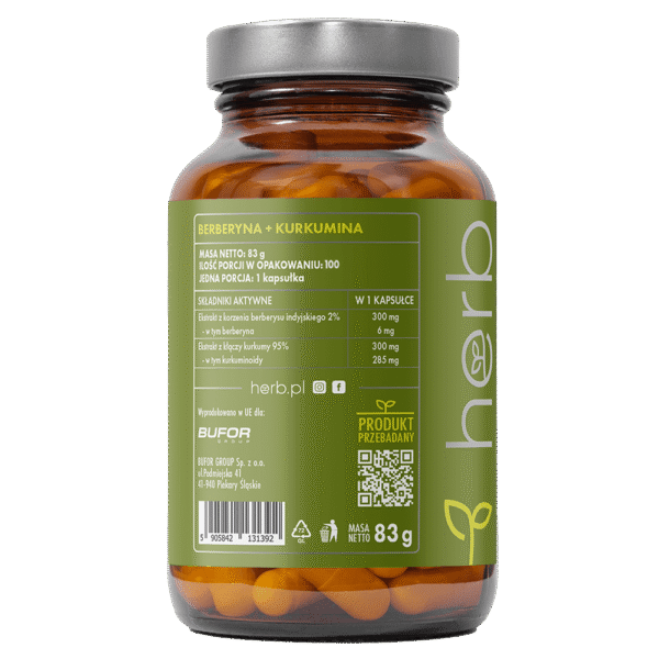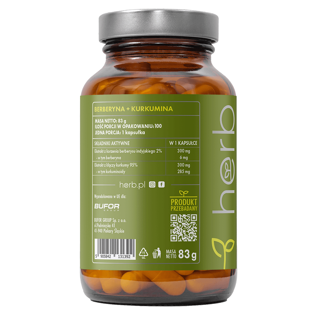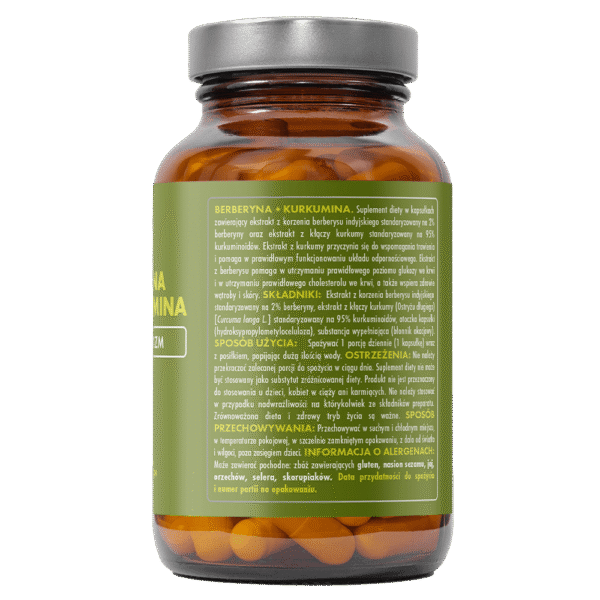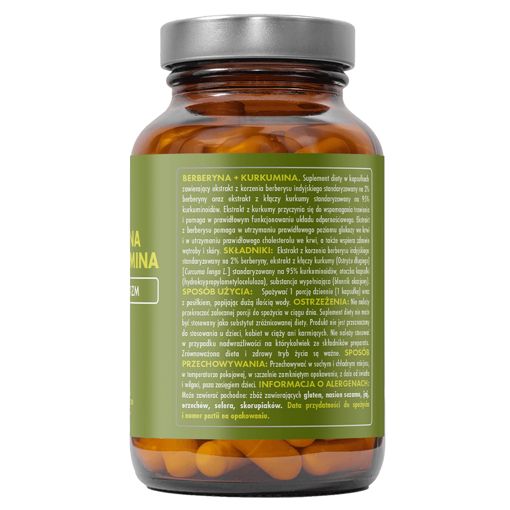 • Synergiczne połączenie – ekstrakt z berberysu + kurkuma standaryzowana na 95% kurkuminoidów