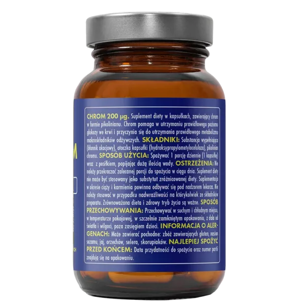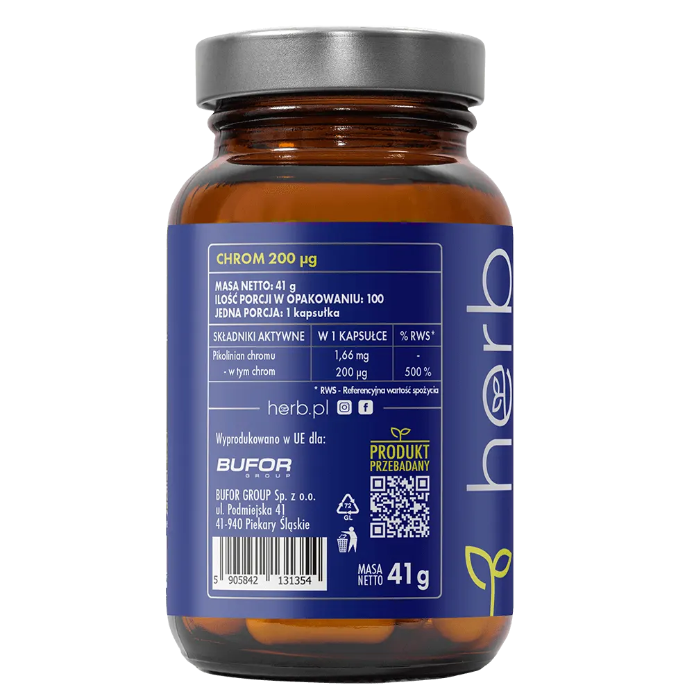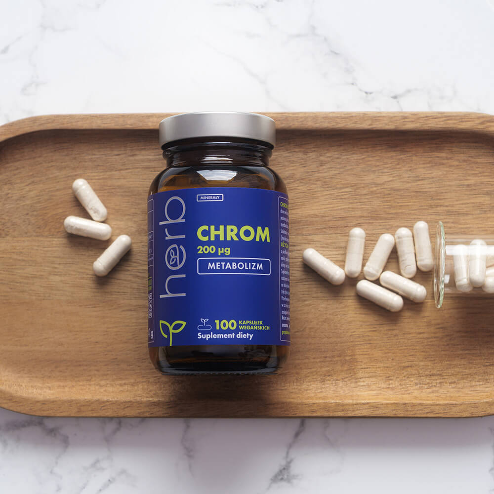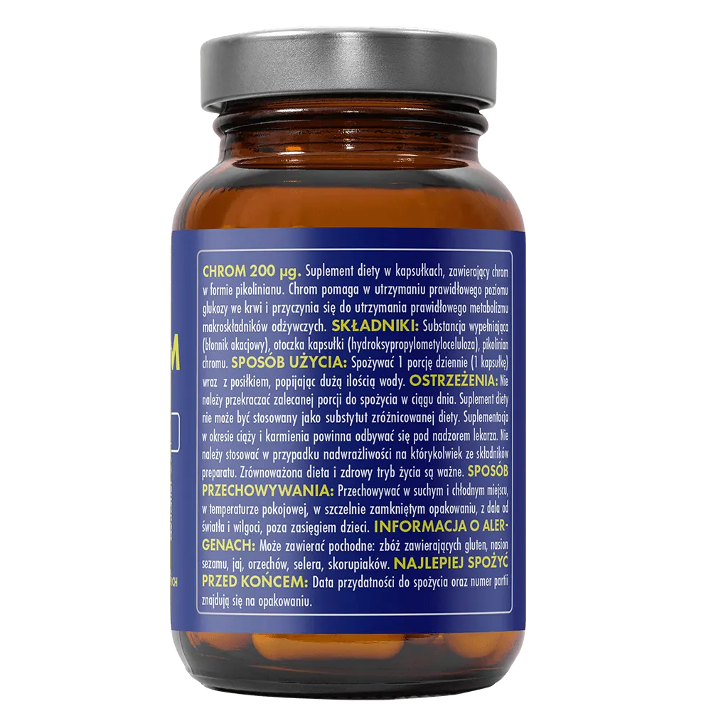 Chrom może również przyczynić się do zmniejszenia łaknienia na słodycze i wspomagać lepszą kontrolę apetytu, co czyni go wartościowym elementem diety redukcyjnej. Każda kapsułka dostarcza aż 200 µg chromu, co stanowi 500% referencyjnej wartości spożycia (RWS). Produkt oparty wyłącznie na niezbędnych składnikach – 100% wegański, bez zbędnych dodatków, idealny dla osób szukających prostych i skutecznych rozwiązań.