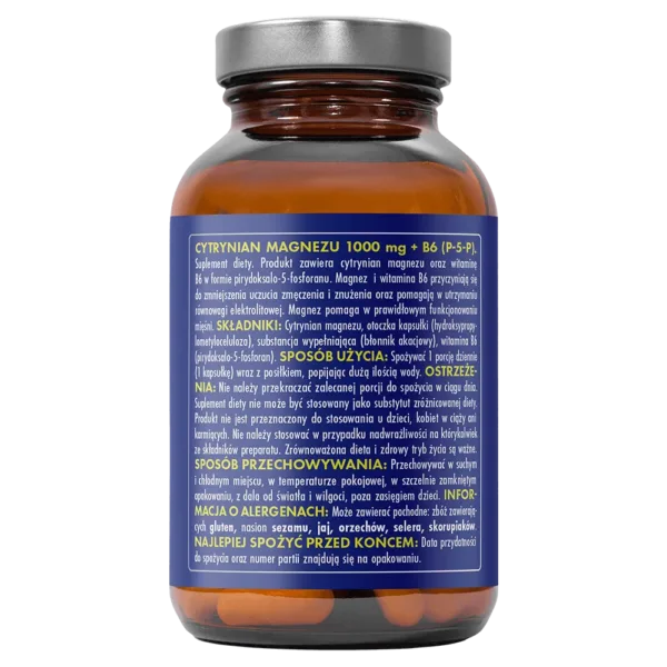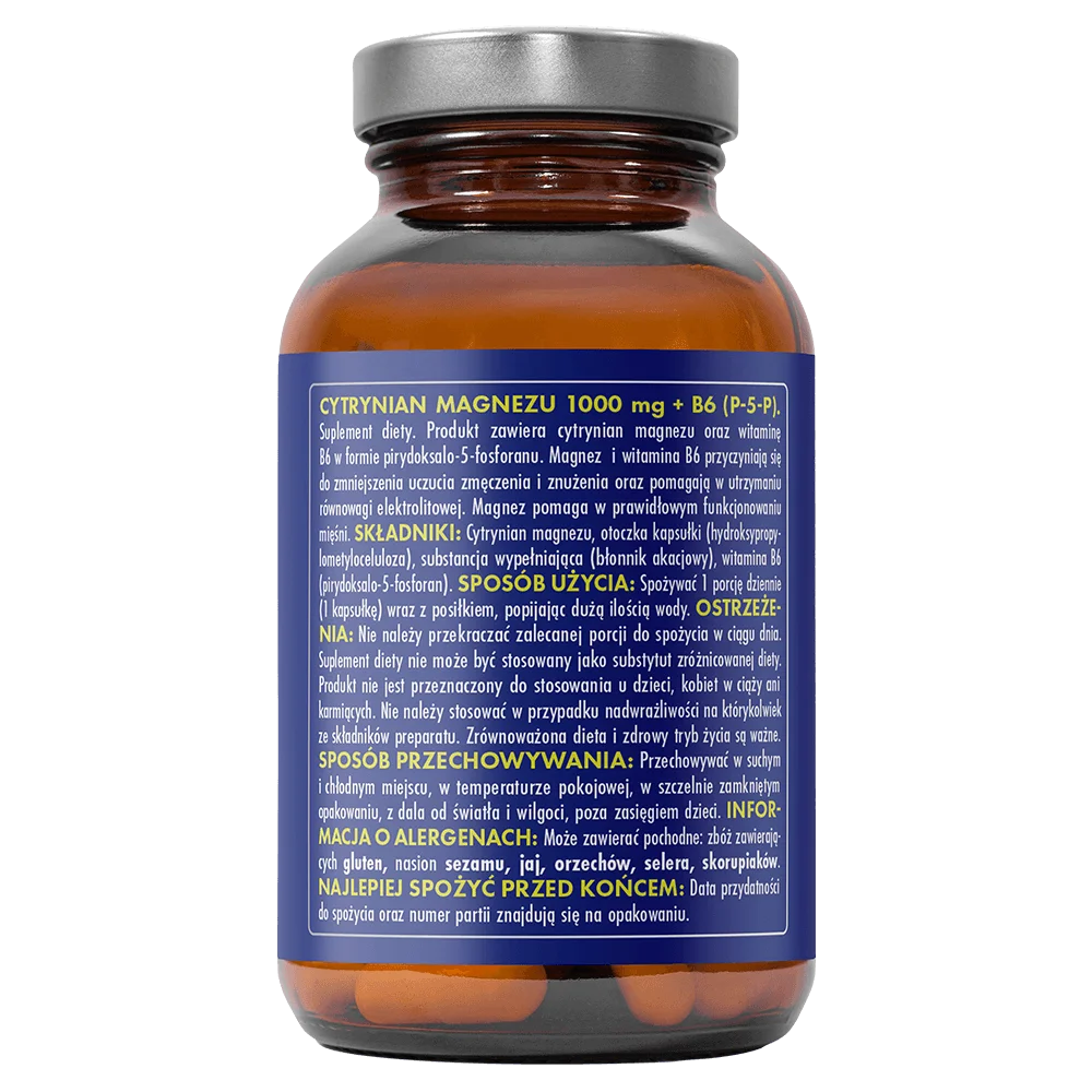 Cytrynian Magnezu 1000 mg + B6 (P-5-P) to suplement diety zawierający dobrze przyswajalną formę magnezu – cytrynian – w dużej dawce, zapewniającej aż 150 mg czystego magnezu w jednej kapsułce. Dodatkowo preparat został wzbogacony o witaminę B6 w formie aktywnej (pirydoksalo-5-fosforanu), co zwiększa skuteczność działania i wspiera metabolizm energetyczny oraz funkcje układu nerwowego.