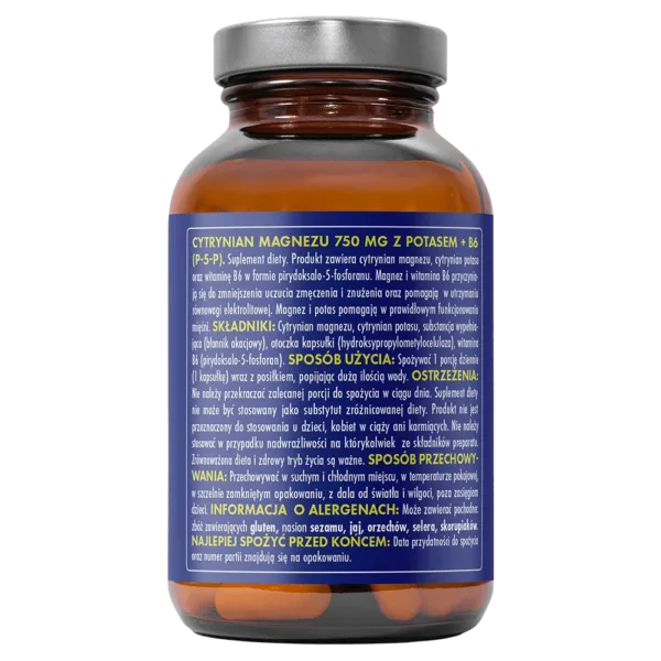 Składniki: Cytrynian magnezu, cytrynian potasu, otoczka kapsułki (hydroksypropylometyloceluloza), witamina B6 (pirydoksalo-5-fosforan).