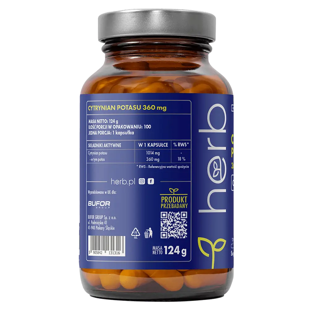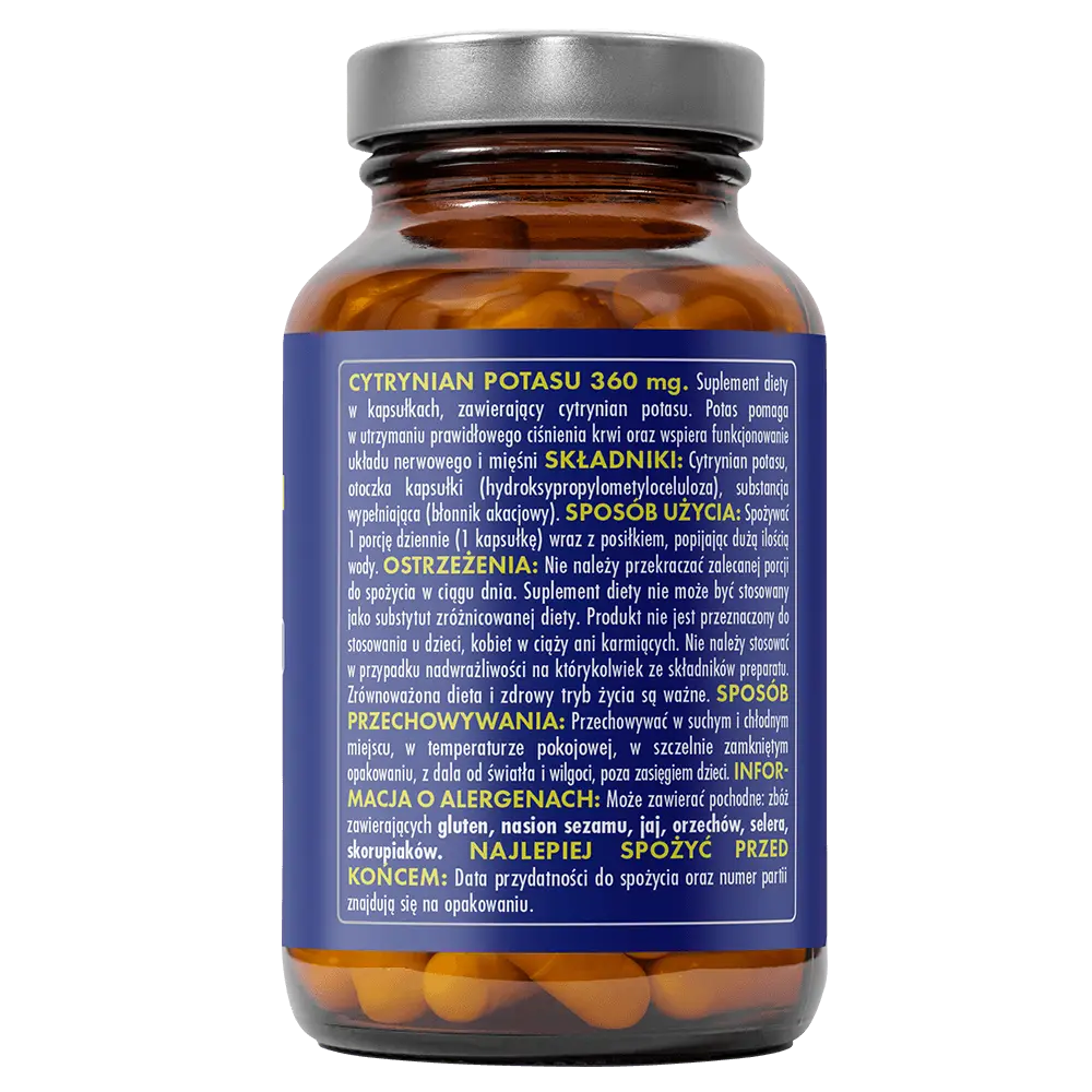 Cytrynian Potasu 360 mg to suplement diety oparty na jednowodnym cytrynianie tripotasu – formie dobrze tolerowanej przez układ pokarmowy i skutecznie wspierającej bilans elektrolitowy. Potas jest kluczowym minerałem dla zachowania prawidłowego ciśnienia krwi, wspomaga także funkcjonowanie mięśni oraz układu nerwowego, co czyni go ważnym elementem codziennej suplementacji, zwłaszcza dla osób aktywnych fizycznie, zestresowanych lub na diecie ubogiej w warzywa.