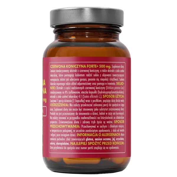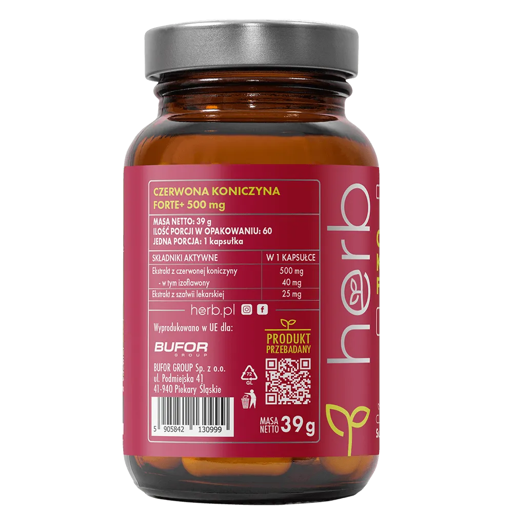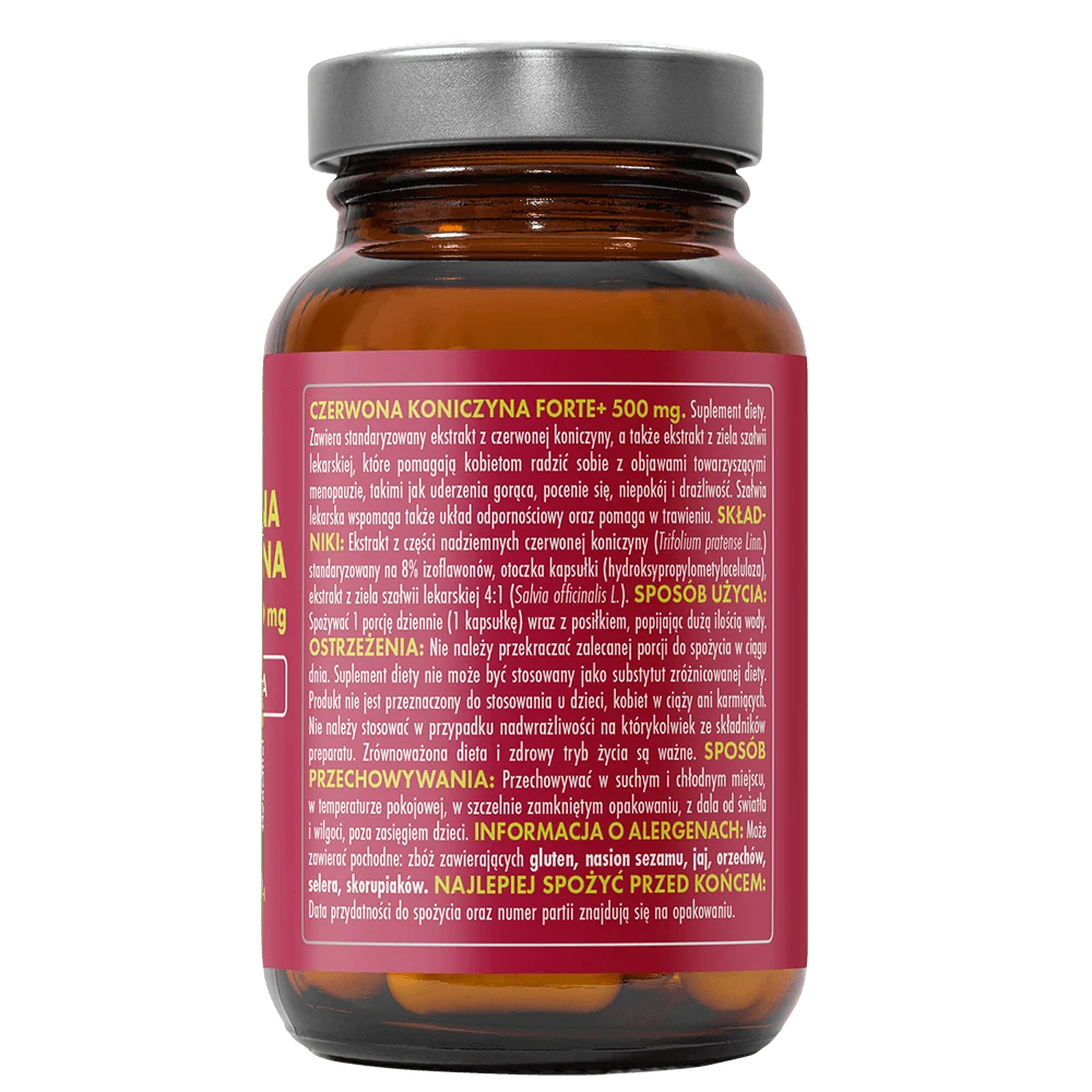 Czerwona Koniczyna FORTE+ 500 mg to kompleksowy suplement diety dla kobiet, zawierający silny ekstrakt z czerwonej koniczyny standaryzowany na 8% izoflawonów – naturalnych fitoestrogenów, które wspierają równowagę hormonalną i łagodzą objawy menopauzy. Dodatkowo wzbogacony został o ekstrakt z szałwii lekarskiej w proporcji 4:1, która wspiera układ odpornościowy, ułatwia trawienie i zmniejsza potliwość.