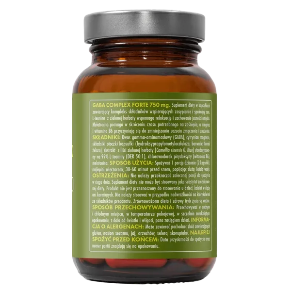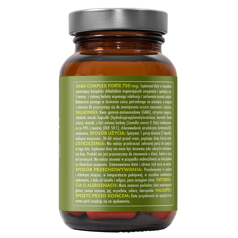 • 750 mg GABA – naturalny neuroprzekaźnik wspierający relaks i spokój.