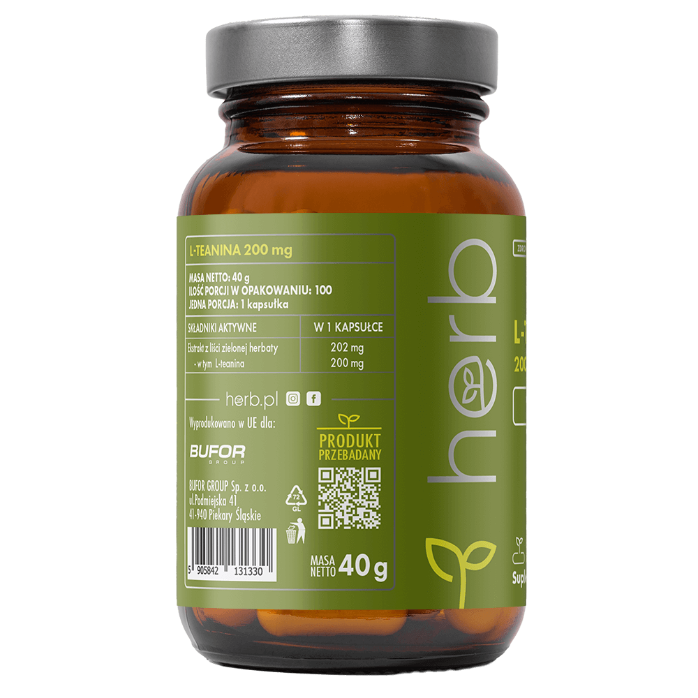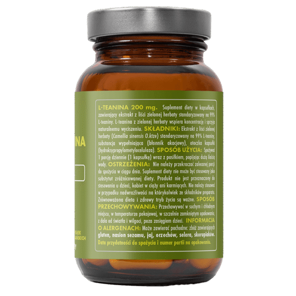 L-Teanina 200 mg to suplement diety zawierający ekstrakt z liści zielonej herbaty (Camellia sinensis), standaryzowany aż na 99% L-teaniny – aminokwasu znanego ze swoich łagodnych, ale skutecznych właściwości wspierających relaks, koncentrację i równowagę psychiczną. L-teanina nie działa uspokajająco w sposób otępiający – wspomaga jasność umysłu i skupienie, jednocześnie redukując napięcie i stres.