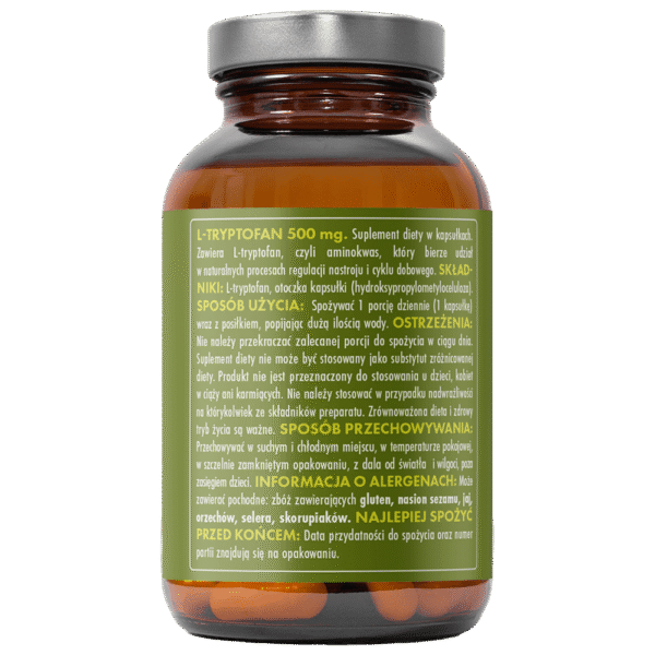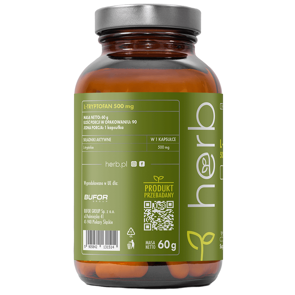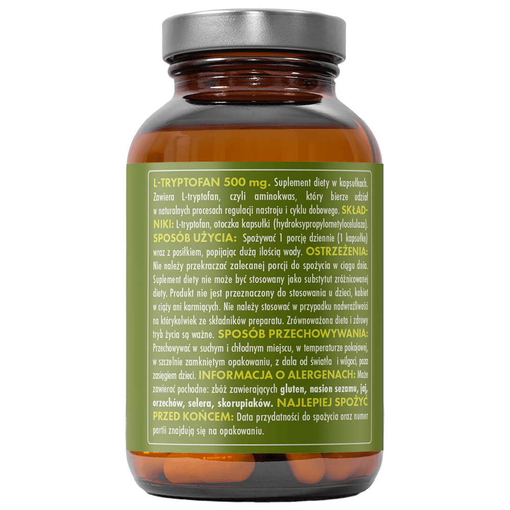 L-tryptofan 500 mg to suplement diety zawierający naturalny aminokwas, który odgrywa kluczową rolę w syntezie serotoniny – neuroprzekaźnika odpowiedzialnego za dobre samopoczucie – oraz melatoniny, regulującej rytm snu i czuwania. Suplementacja L-tryptofanem wspiera równowagę emocjonalną, łagodzi napięcie i może poprawiać jakość snu w okresach zwiększonego stresu lub zmęczenia.