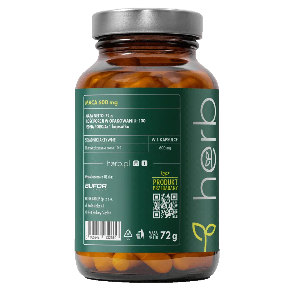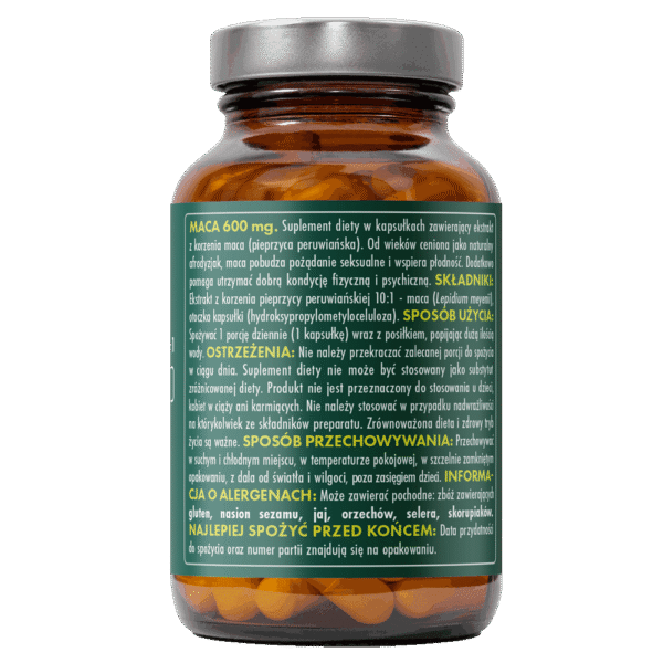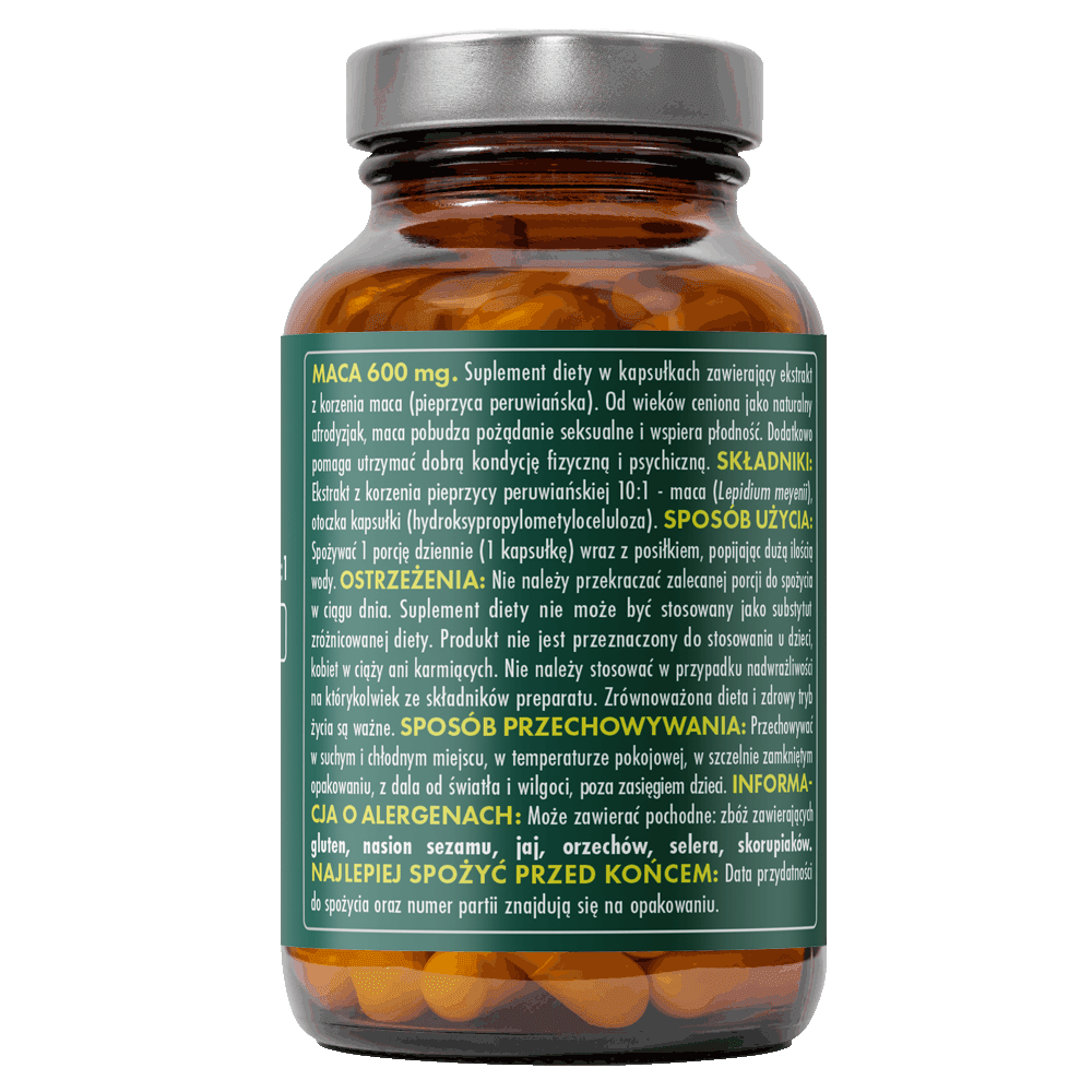 Maca 600 mg to suplement diety zawierający ekstrakt 10:1 z korzenia maca (Lepidium meyenii), rośliny pochodzącej z wysokogórskich terenów Peru. Maca od wieków znana jest jako naturalny afrodyzjak – wspiera pożądanie seksualne, płodność i równowagę hormonalną zarówno u kobiet, jak i mężczyzn. Działa adaptogennie, wspomagając organizm w walce ze stresem i przemęczeniem.