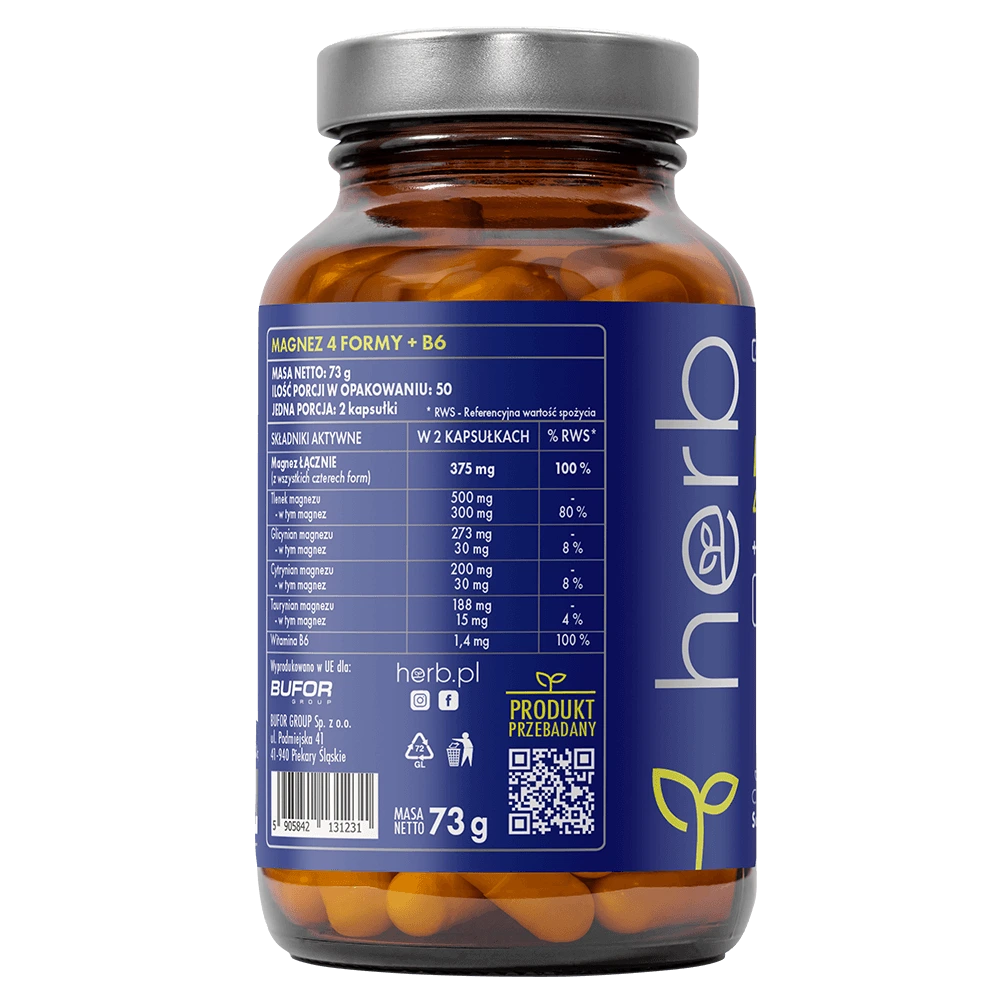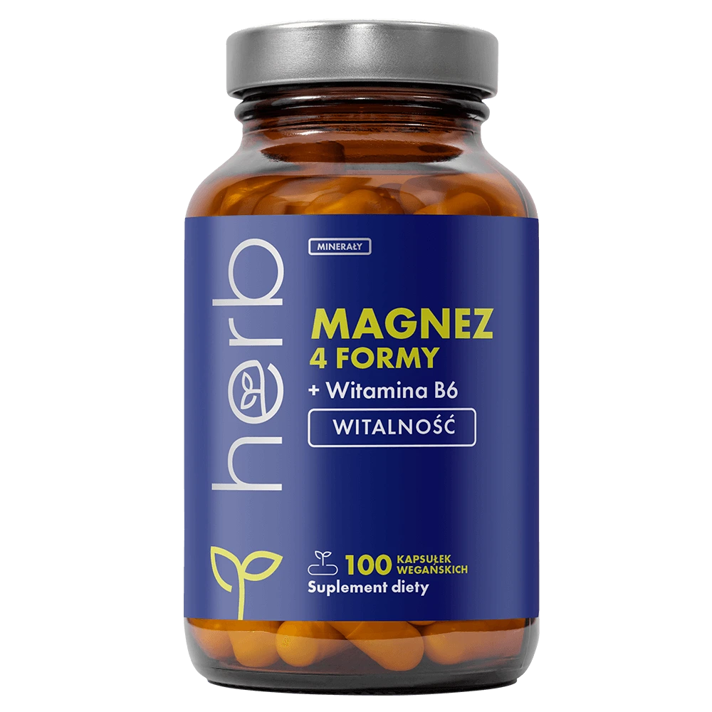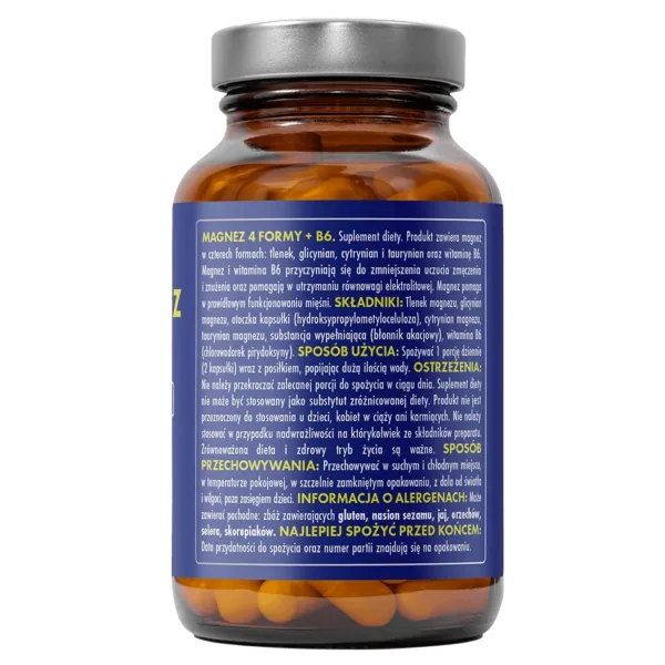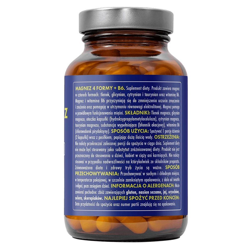 Magnez 4 Formy + B6 to zaawansowany suplement łączący cztery różne formy magnezu: tlenek, glicynian, cytrynian i taurynian. Dzięki takiej kompozycji, produkt oferuje szerokie spektrum działania i lepsze przyswajanie. Wzbogacenie formuły o witaminę B6 dodatkowo wspiera metabolizm energetyczny, pracę mięśni oraz układ nerwowy. Dwie kapsułki dostarczają pełną dzienną dawkę magnezu – 375 mg – oraz 100% referencyjnej wartości spożycia witaminy B6.