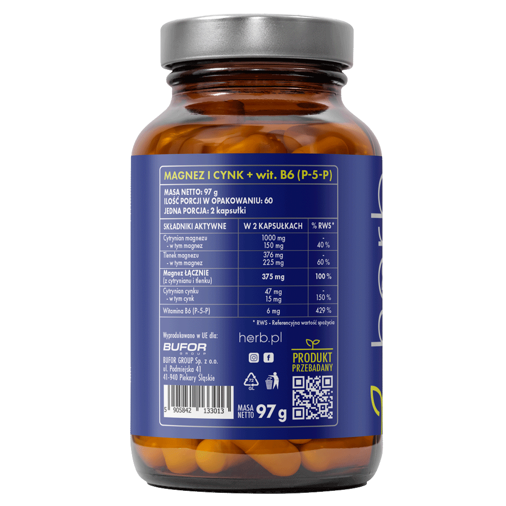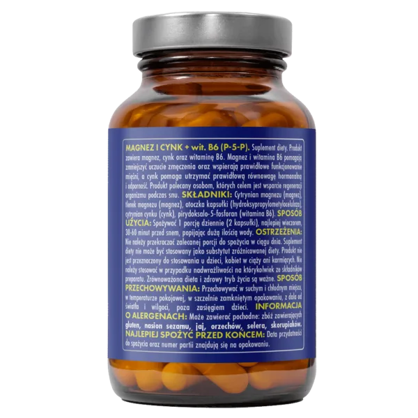 Magnez i Cynk + wit. B6 (P-5-P) to kompleksowy suplement diety zaprojektowany z myślą o wsparciu organizmu w czasie nocnej regeneracji. Zawiera magnez w dwóch formach (cytrynian i tlenek), który wspiera prawidłową pracę mięśni i redukuje uczucie zmęczenia. Witamina B6 w formie aktywnej (P-5-P) działa synergicznie z magnezem, poprawiając jego wchłanianie i wpływając pozytywnie na układ nerwowy.