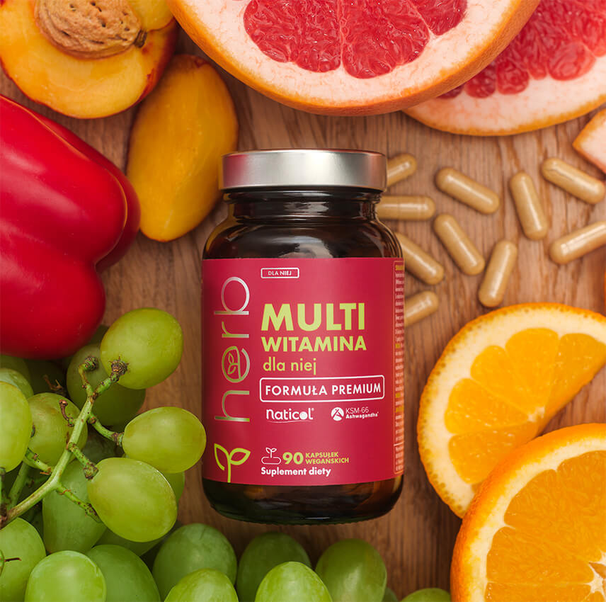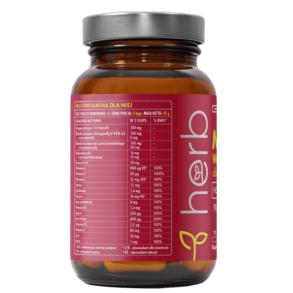 Multiwitamina dla Niej to zaawansowany suplement diety zawierający zestaw najważniejszych witamin i składników mineralnych, które wspierają codzienne funkcjonowanie kobiecego organizmu. Oprócz podstawowych mikroskładników (m.in. witamin z grupy B, witaminy C, D, E, cynku, miedzi) zawiera także kolagen rybi Naticol®, kwas hialuronowy i koenzym Q10 – składniki cenione za korzystny wpływ na skórę, włosy i paznokcie oraz opóźnianie procesów starzenia.