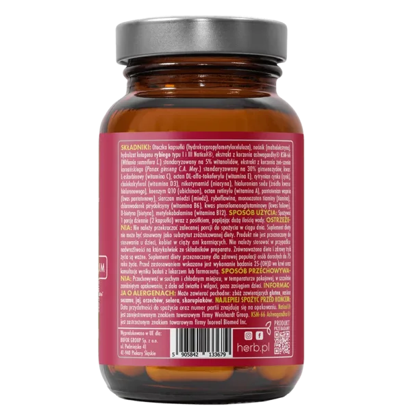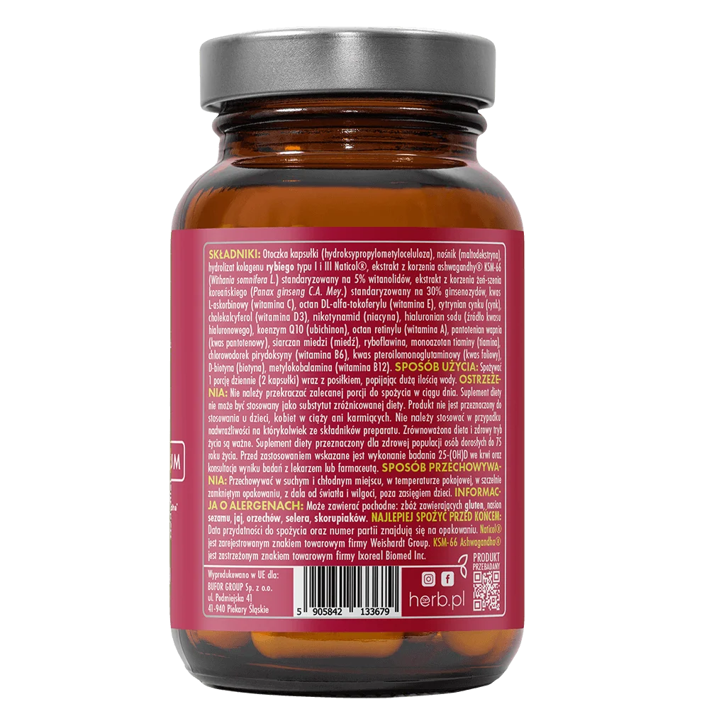 Formuła została dodatkowo wzmocniona adaptogenami – KSM-66® ashwagandhą oraz żeń-szeniem koreańskim, które wspierają równowagę emocjonalną, poprawiają odporność na stres i wspomagają naturalną witalność. Suplement polecany kobietom aktywnym, narażonym na stres, prowadzącym intensywny tryb życia, a także tym, które chcą dbać o urodę od wewnątrz. 2 kapsułki dziennie to pełna dawka skutecznych składników – bez kompromisów.