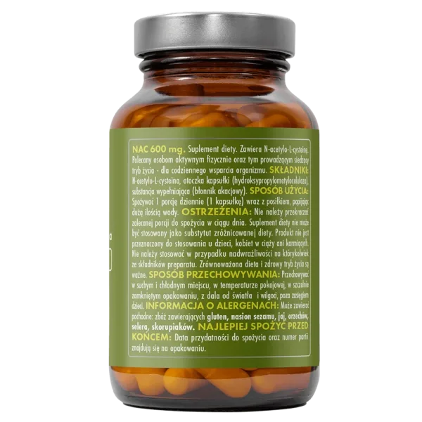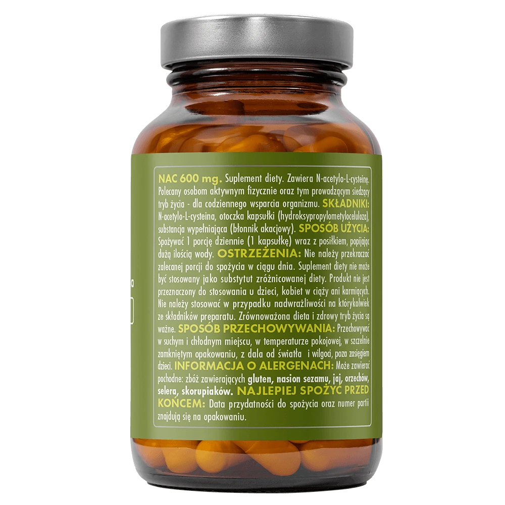 NAC 600 mg to suplement diety zawierający N-acetylo-L-cysteinę – stabilną formę aminokwasu L-cysteiny, znaną ze swojego działania jako prekursor glutationu – jednego z najważniejszych antyoksydantów w organizmie. Każda kapsułka dostarcza aż 600 mg czystego NAC, który wspiera procesy detoksykacyjne, wspomaga regenerację i funkcje wątroby oraz pomaga utrzymać odporność na wysokim poziomie.