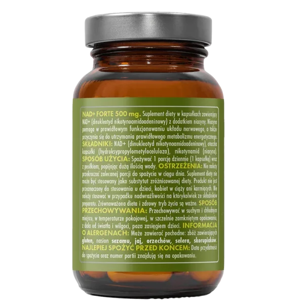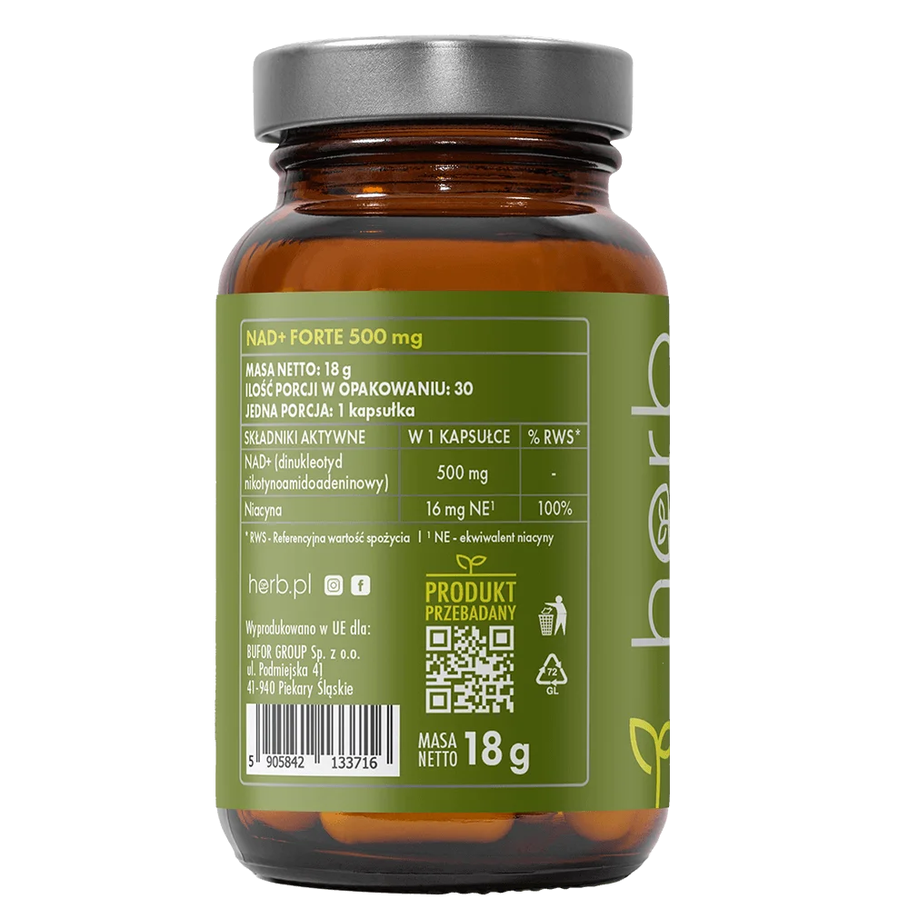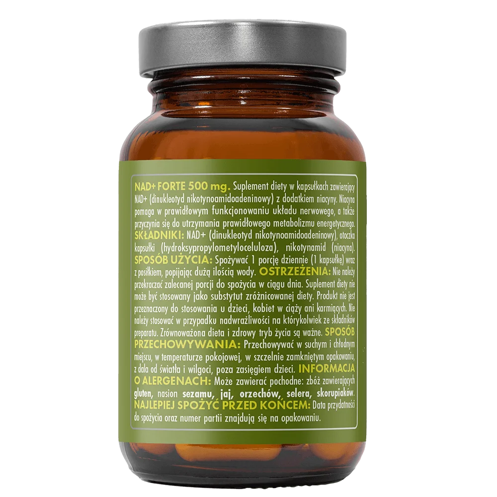 NAD+ Forte 500 mg to nowoczesny suplement diety zawierający dinukleotyd nikotynoamidoadeninowy (NAD⁺) – substancję naturalnie występującą w organizmie, która odgrywa kluczową rolę w procesach przemiany materii i produkcji energii w komórkach. Z wiekiem poziom NAD⁺ w organizmie maleje, co może wpływać na spadek witalności i regeneracji. Suplementacja NAD⁺ może wspierać sprawność mitochondrialną i ogólną wydolność organizmu.