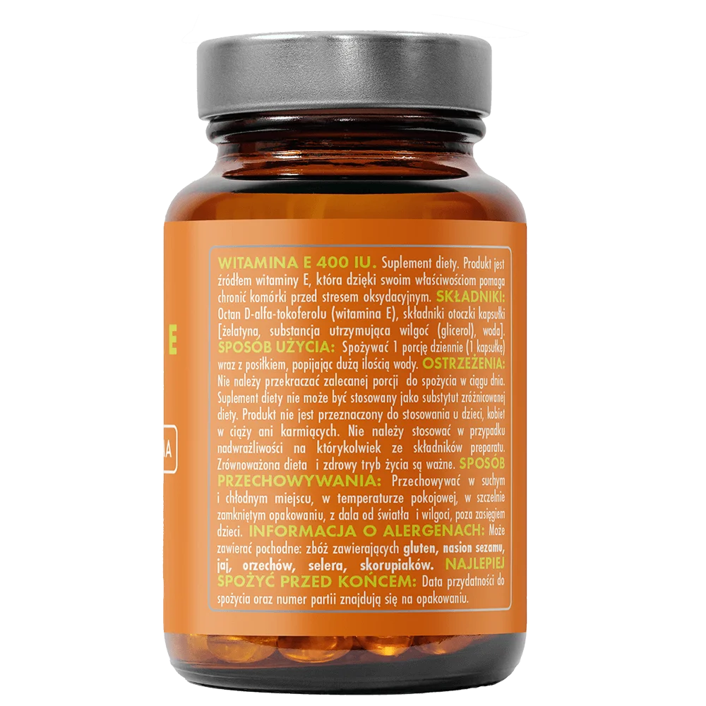 Witamina E 400 IU to zaawansowany suplement diety zawierający 294 mg (400 IU) witaminy E w postaci octanu DL-alfa-tokoferylu w każdej miękkiej kapsułce. Został starannie opracowany, aby dostarczyć skoncentrowaną dawkę tej kluczowej witaminy, znaną ze swoich wyjątkowych właściwości antyoksydacyjnych. Witamina E jest niezbędna dla ochrony komórek przed uszkodzeniami spowodowanymi przez wolne rodniki, które są jednym z głównych czynników przyspieszających procesy starzenia się oraz mogących przyczyniać się do rozwoju różnych schorzeń. Regularne przyjmowanie witaminy E, szczególnie w tak skoncentrowanej formie, jaką oferuje Vita E, może pomóc w zachowaniu zdrowia i młodego wyglądu skóry, poprawie kondycji włosów i paznokci, a także w ochronie wzroku i wspomaganiu funkcji układu nerwowego.